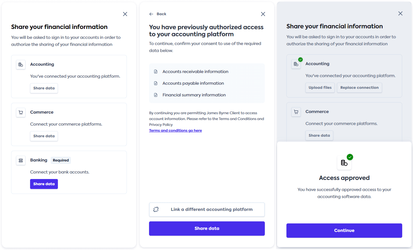 You may need to request additional consent from your customer to use their previously shared financial data for a different purpose. For example, if the customer linked a platform to use your application's cash flow forecasting dashboard, you need additional consent from them if you want to use that data for a lending assessment.