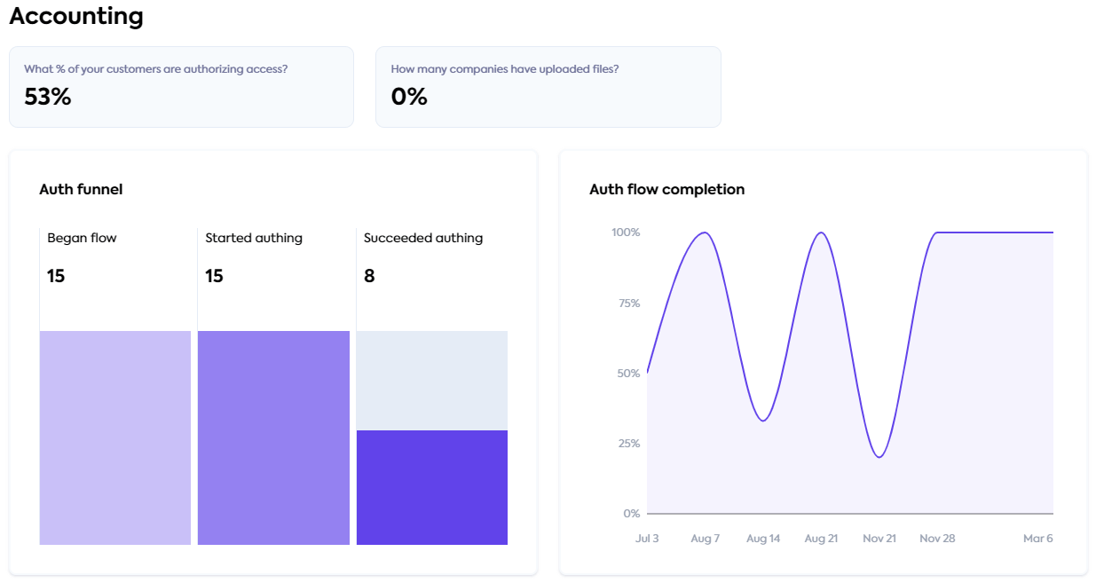 Navigate to Monitor > Auth flow > Overview to discover the overall percentage of your customers that have authorized the integration connections and the overall percentage of companies that uploaded a file as part of their auth process.