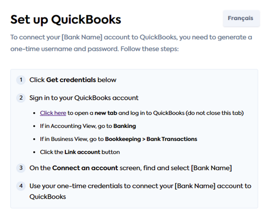 In response, you will receive login credentials that your user needs to enter in QBO Banking to link a bank account. Share them with the user, and consider providing instructions on steps to take in QBO. For example, this is how we manage it in our QBO Link flow: