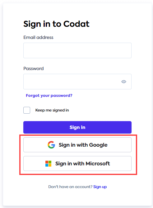 As long as the email addresses are the same, attempting to sign in with a Google or Microsoft account will automatically link the account to the existing Codat account. Users must first have been invited to use Codat with the same email address that they use to access the third-party account (Google or Microsoft).